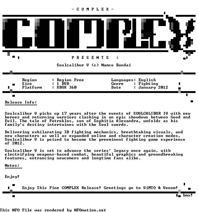 SoulCalibur V picks up 17 years after the events of SoulCalibur IV with new heroes and returning warriors clashing in an epic showdown between good and evil. The tale of Patroklos, son of Sophitia Alexandra, unfolds as his familys destiny intertwines with the Soul swords. TurboBit http://linksafe.me/d/93367828a3/1-3-3-8.com_complex-soulcalibur5.iso.html
